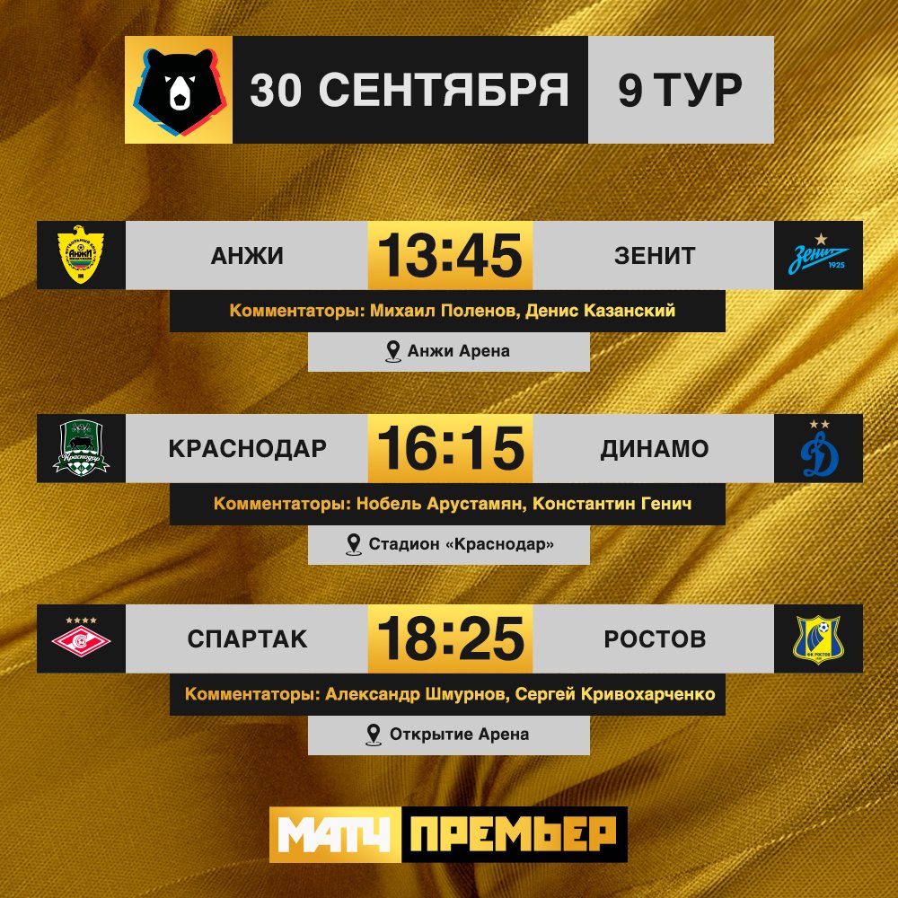 | 16:30 | Краснодар | 3 : 0 | Динамо М | завершен | ||||||||||||