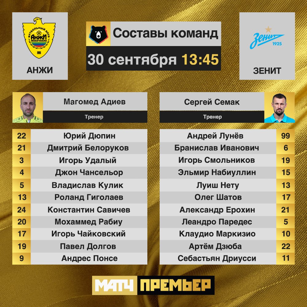 «Анжи»: Дюпин, Белоруков, Удалый, Чансельор, Кулик, Гиголаев, Савичев, Мохаммед, Чайковский, Долгов, Понсе. Запасные: Сугробов, Калошин, Ондуа, Глебов, Хамдамов, Маркелов, Ахъядов. «Зенит»: Лунёв, Смольников, Иванович, Нету, Набиуллин, Маркизио, Паредес, Ерохин, Шатов, Дриусси, Дзюба. Запасные: Кержаков, Лодыгин, Анюков, Мевля, Маммана, Оздоев, Кузяев, Мак, Эрнани, Краневиттер, Заболотный, Кокорин. ![]() |
