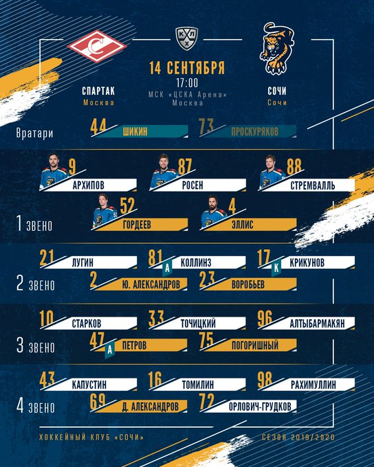 Тренерский штаб «Спартака» назвал состав на четвёртый матч домашней серии против ХК «Сочи». Вернулись на площадку Патрик Херсли и Антон Злобин. Шведский защитник сыграет в первой паре обороны вместе с Яковом Рыловым. Место в воротах вновь займёт Павел Хомченко, его сменщиком будет Никита Беспалов. Матч «Спартак» - ХК «Сочи» начнётся в 17:00, за его ходом можно следить в прямой трансляции клубных социальных сетях. |