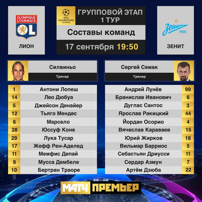 Стали известны стартовые составы «Зенита» и «Лиона» на матч первого тура группового турнира Лиги чемпионов, информирует официальный сайт УЕФА. Встреча пройдет во Франции, сегодня, 17 сентября. Стартовый состав «Лиона»: Лопеш — Коне, Дюбуа, Марселу, Денайер — Тузар, Мендес, Рейне-Аделаида — Траоре, Депай, Дембеле. Стартовый состав «Зенита»: Лунев — Дуглас Сантос, Ракицкий, Иванович, Караваев — Дриусси, Осорио, Барриос, Жирков — Дзюба, Азмун. |
