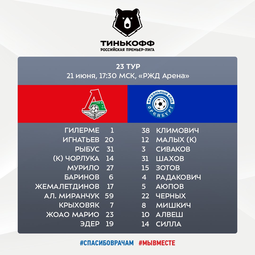 «Локомотив»: Гильерме, Игнатьев, Рыбусь, Чорлука, Мурило, Баринов, Жемалетдинов, Ал. Миранчук, Крыховяк, Жоау Мариу, Эдер. Запасные: Коченков, Медведев, Живоглядов, Кверквелия, Идову, Лысов, Ан. Миранчук, Рыбчинский, Куликов, Тугарев, Мухин, Сулейманов. «Оренбург»: Климович, Малых, Сиваков, Шахов, Зотов, Радакович, Аюпов, Черных, Мишкич, Рикарду Алвеш, Силла. Запасные: Руденко, Кеняйкин, Козлов, Лапшов, Готлиб, Кулишев, Липовой, Капленко, Шкофлек, Куат, Чуканов, Фамейе. |